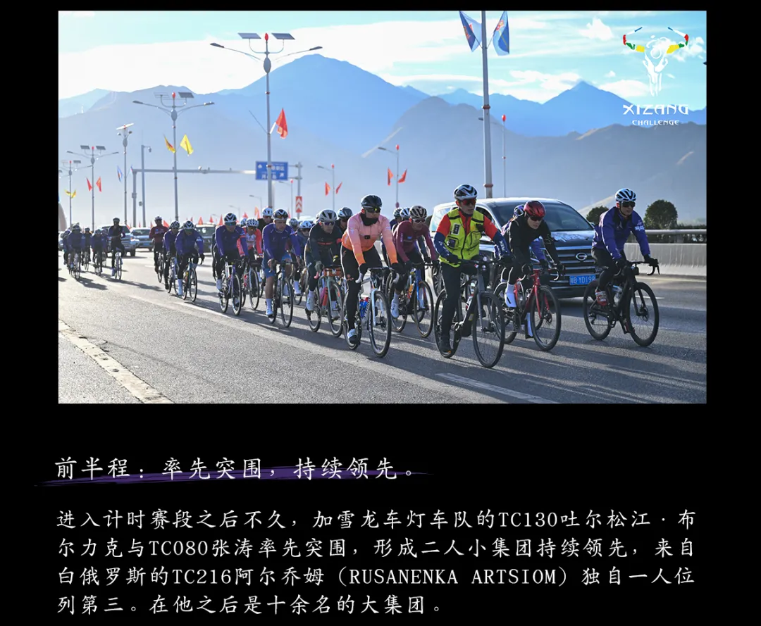 Shortly after the timed segment began, Gaciron's riders Tursunjan Burelik (TC130) and Zhang Tao (TC080) staged a bold attack. They quickly established a two-man breakaway, working together to maintain a steady lead. They were followed by Belarusian rider Artsiom Rusanauka (TC216), holding third position alone. Chasing behind him was the main peloton, a group of over a dozen riders.