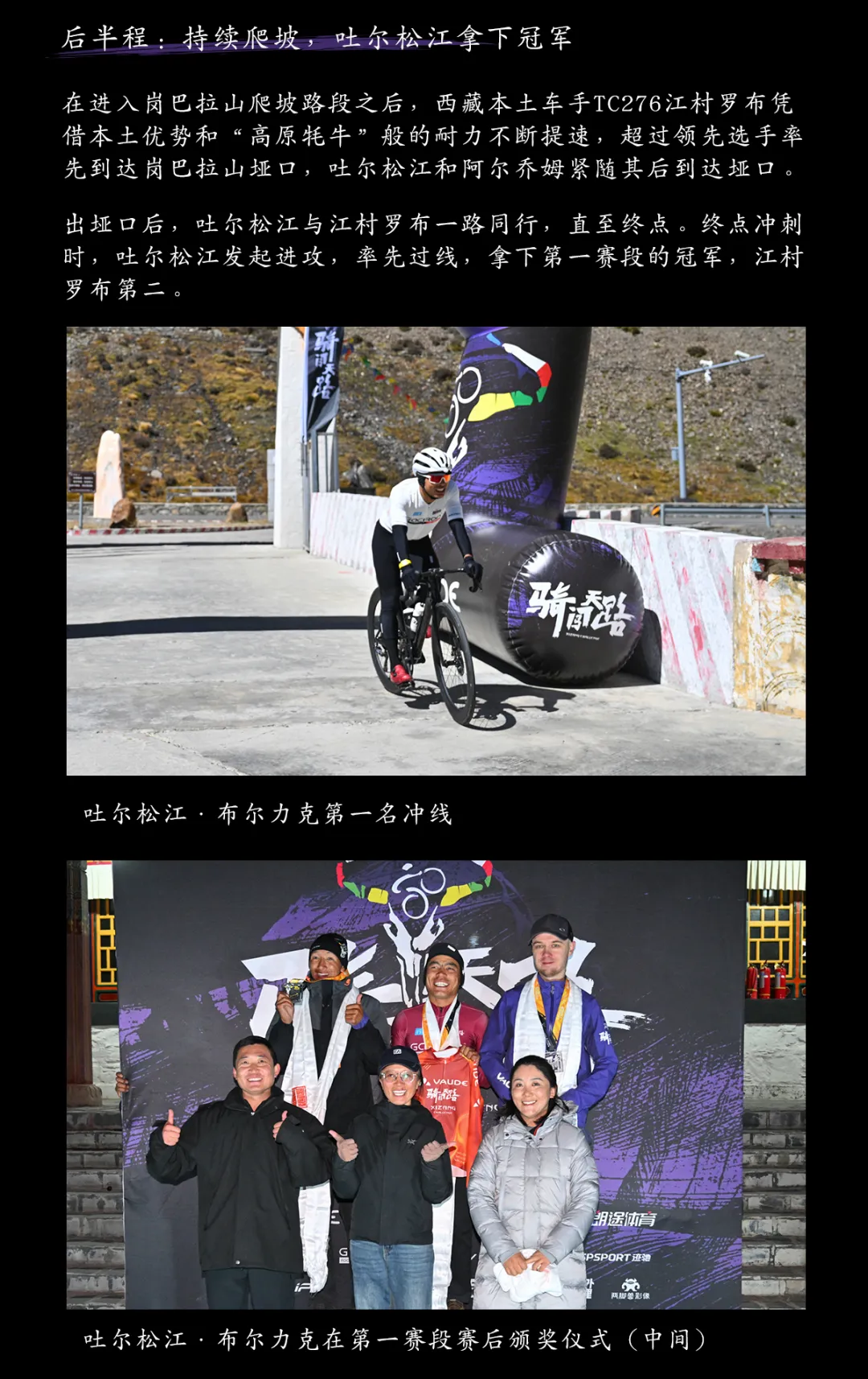 After descending from the pass, Tursunjan and Jiacun Luobu rode together, matched in a tense duel all the way to the finish line. In the final sprint, Tursunjan launched his attack and crossed the line first, claiming victory in Stage 1, with Jiacun Luobu taking a well-earned second place.