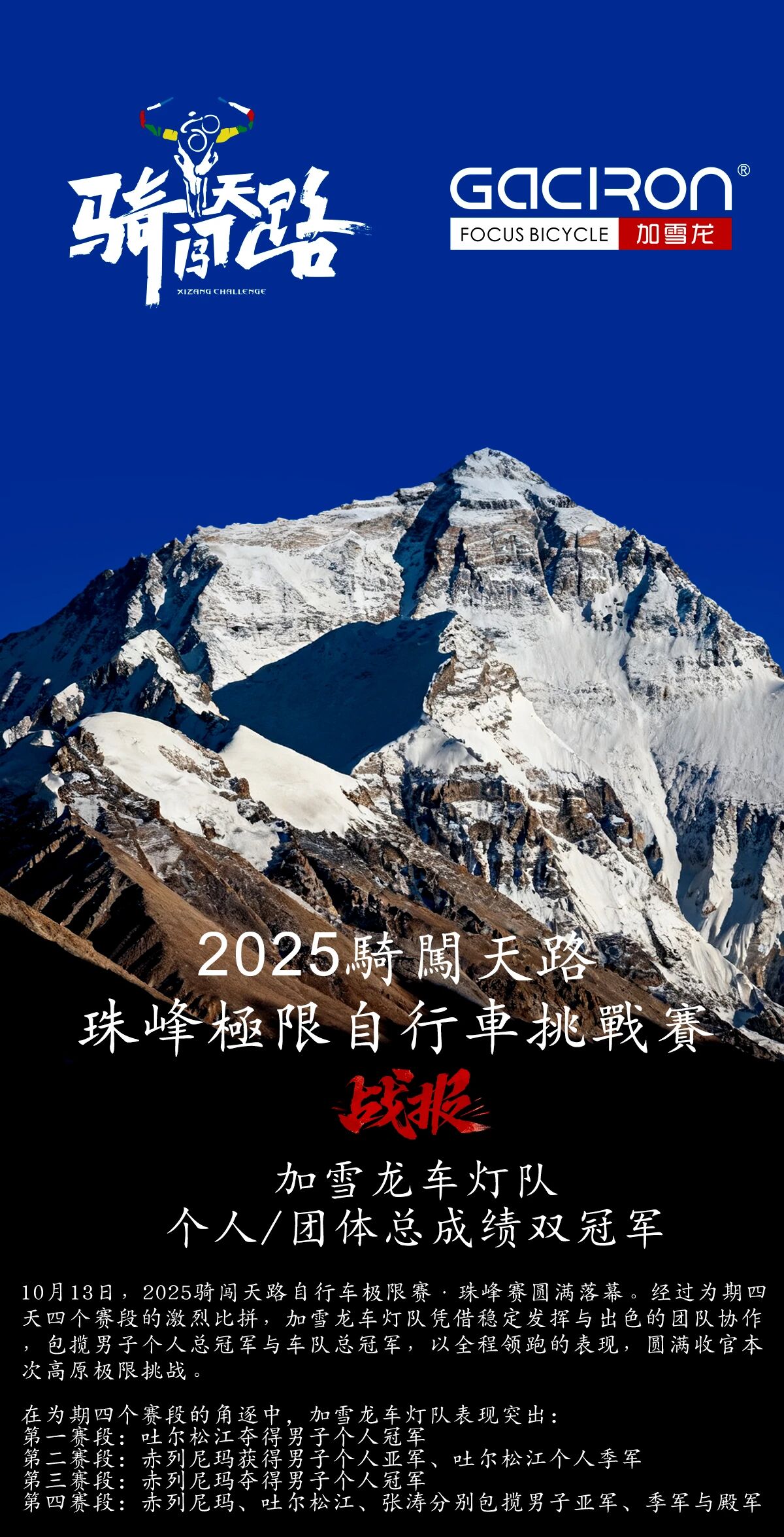 SHIGATSE, TIBET – October 13, 2025 – The 2025 Ride Across Tibet: Everest Extreme Cycling Challenge concluded successfully on October 13th after four grueling stages. Demonstrating remarkable consistency and superior teamwork, the Gaciron Lights Team achieved a magnificent double victory, securing both the Individual General Classification (GC) title and the Team General Classification title. They led the race from start to finish, perfectly capping off this extreme high-altitude expedition.